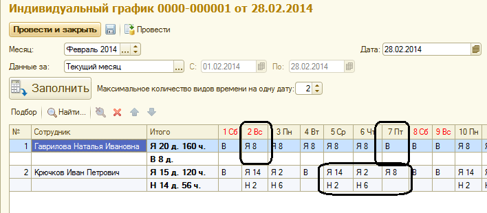 - Сотрудница Гаврилова Н.И. вышла на работу 2 числа (в воскресенье) с предоставлением выходного дня в пятницу 7го.