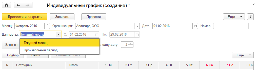 В документе указывается расчетный период (месяц), в котором производится ввод индивидуальных графиков. Причем можно создать график, как за текущий, так и за прошлый период.