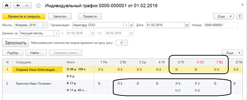 В документе заполняется сотрудник либо список сотрудников, для которых создается индивидуальный график. Автоматически при этом проставляется тот график, который был указан при приеме на работу, который затем корректируется пользователем.