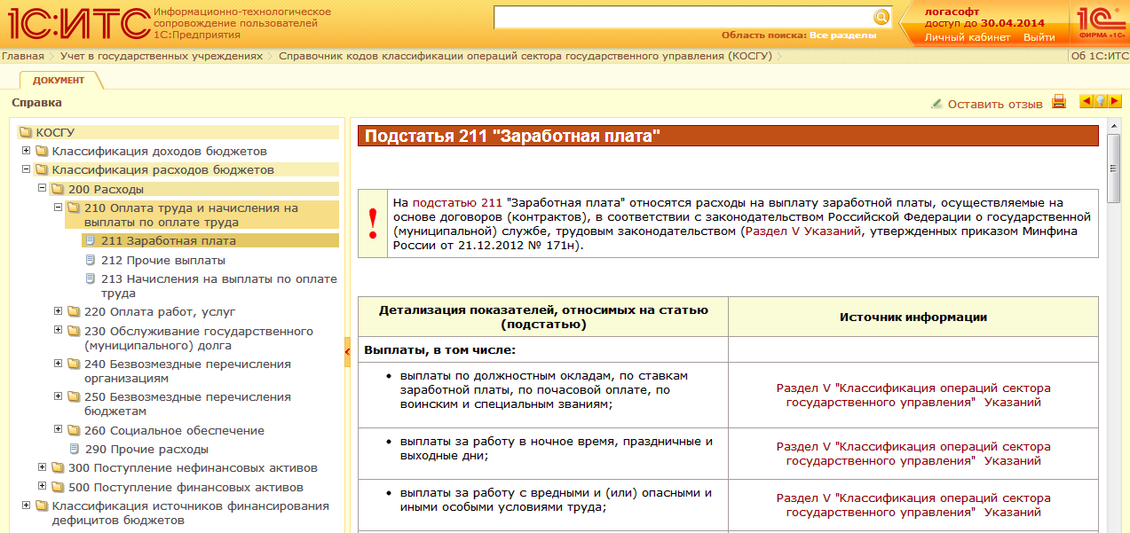 Таким образом, статьи по КОСГУ сгруппированы в Справочнике в соответствии с бюджетной классификацией (первый уровень Справочника КОСГУ)