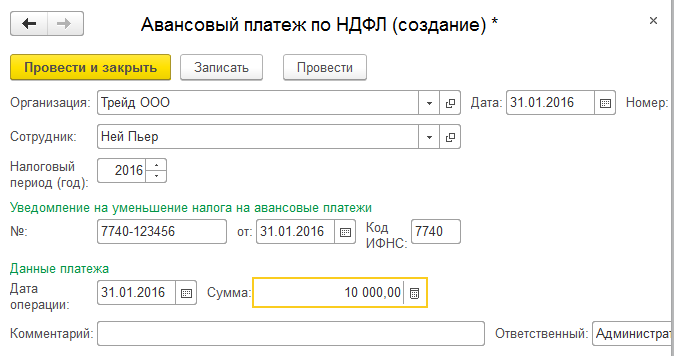 После проведения данного документа расчет НДФЛ будет производиться с учетом авансового платежа. Например, доход сотрудника за месяц составил 30 000 руб. НДФЛ составит 3 900 руб. Однако поскольку НДФЛ уже был уплачен авансом в размере 10 000 руб., сотрудник получает на руки 30 000 руб. Остаток аванса по НДФЛ (10 000-3 900 = 6 100 руб.) будет учтен в последующих месяцах.
