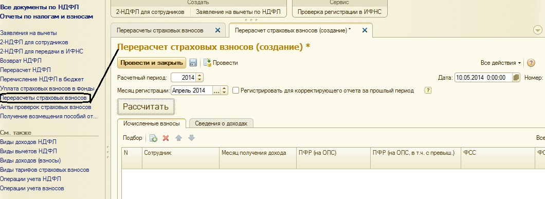 Также в программе реализован документ "Перерасчеты страховых взносов". Он используется, если требуется пересчитать взносы при изменениях "задним числом" и отразить корректировки к отчетности.