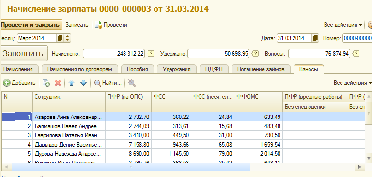 Как уже отмечалось выше, расчет страховых взносов производится в документе "Начисление зарплаты" с учетом всех выполненных ранее настроек. Для увольняющихся сотрудников взносы рассчитываются непосредственно в документе "Увольнение".