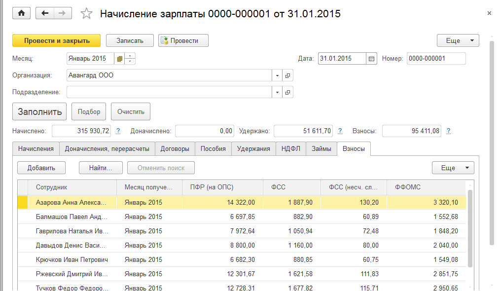 Как уже отмечалось выше, расчет страховых взносов производится в документе "Начисление зарплаты" с учетом всех выполненных ранее настроек. Для увольняющихся сотрудников взносы рассчитываются непосредственно в документе "Увольнение".