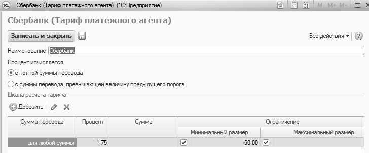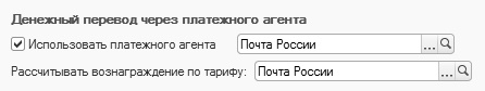 По умолчанию в программе настроены тарифы Почты России и Сбербанка, остальные тарифы можно настроить самостоятельно в справочнике "Тарифы платежных агентов". Обратите внимание на порядок расчета почтового сбора по тарифу:
