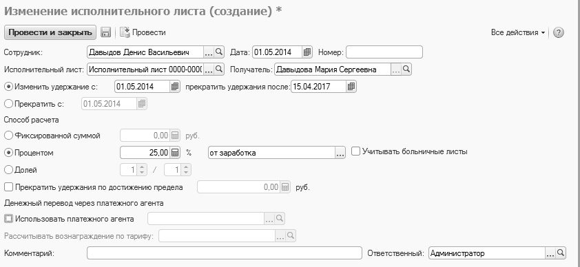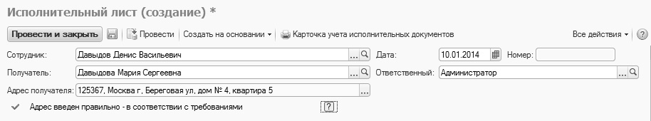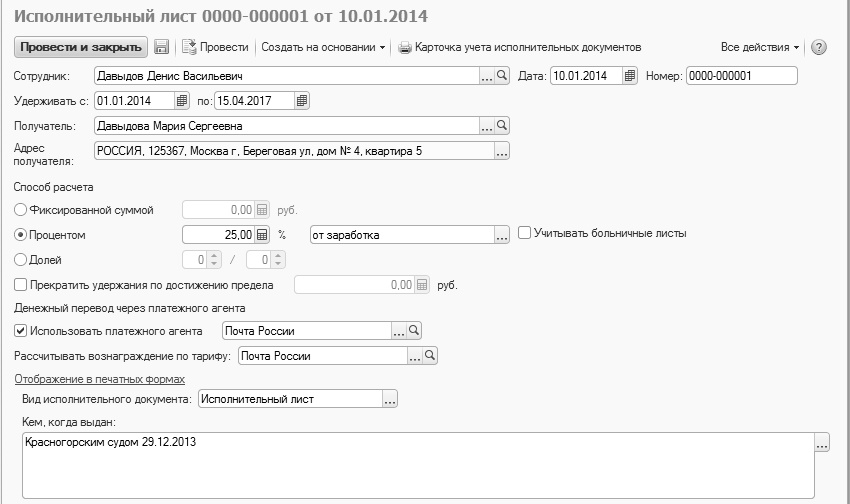 Создадим документ "Исполнительный лист" на сотрудника Давыдова Д.В.: с 01.01.2014 у него будет удерживаться 25% заработка в пользу Давыдовой Марии Сергеевны, пересылка осуществляется ФГУП "Почта России" по территории РФ