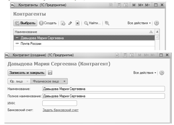 При заполнении поля "получатель" и "платежный агент" заполним справочник "Контрагенты" следующими данными.