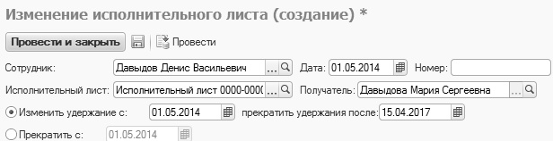 • Изменить условия по исходному документу или прекратить удержания с указанной даты.