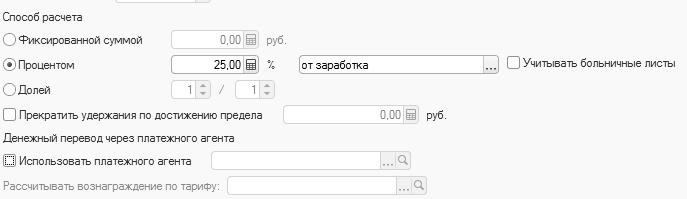Если при удержании сумм по исполнительным листам с сотрудника не удерживаются никакие комиссии в пользу платежных агентов (Почта России, банк и т.п.), то раздел по платежным агентам не заполняется. Если же при удержании необходимо удержать сумму почтового сбора или тариф в пользу банка, то следует выбрать платежного агента и порядок расчета суммы. Платежный агент создается в справочнике "Контрагенты".