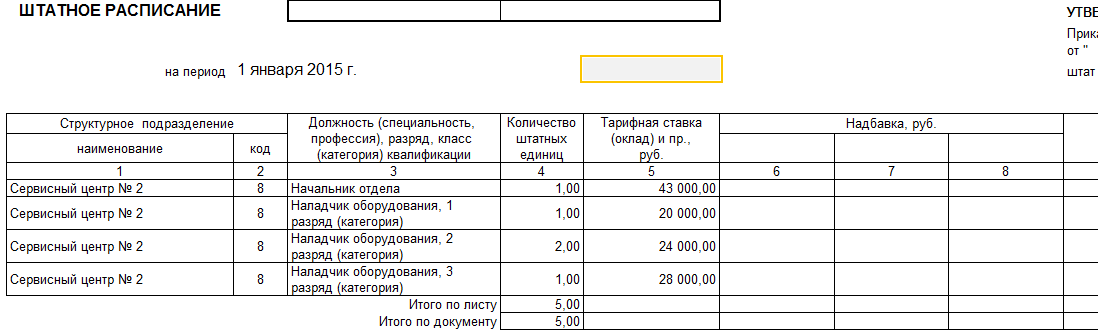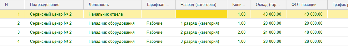 В документ "Утверждение штатного расписания" по ОАО "Орбита" добавим позиции по Сервисному центру №2. При этом Тарифная группа, а также разряд не являются обязательными к заполнению, значение Оклада (или часовой тарифной ставки) может быть внесено в программу вручную.