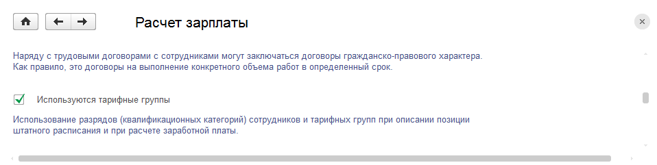 Для позиций штатного расписания указываем тарифную группу и разряд. При выборе начисления "Оплата по окладу" значение оклада будет заполнено в соответствии с разрядом и тарифной группой.