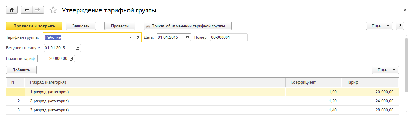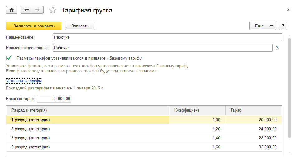По ссылке "Установить тарифы" создаем документ "Утверждение тарифной группы". В качестве базового тарифа может быть установлена месячная часовая или дневная ставка.