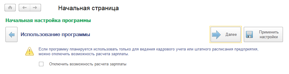 В учебной базе предполагается вести не только кадровый учет, но и расчет зарплаты, поэтому данный флаг не устанавливается, продолжим выполнять действия, нажав команду "Далее".