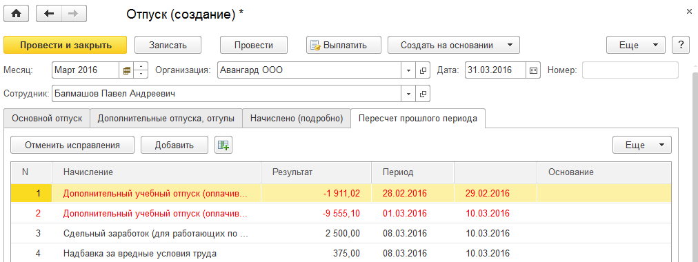 Сотруднику ООО "Авангард" Балмашову П.А. в феврале начислена сумма отпускных (учебный отпуск). В марте оказалось, что отпуск заканчивается раньше - 07.03.2016, необходимо отозвать из отпуска и пересчитать отпускные. Создадим документ-исправление. Для этого откроем февральский документ "Отпуск" (в нем уже ничего не меняем!), и нажимаем команду "Исправить".