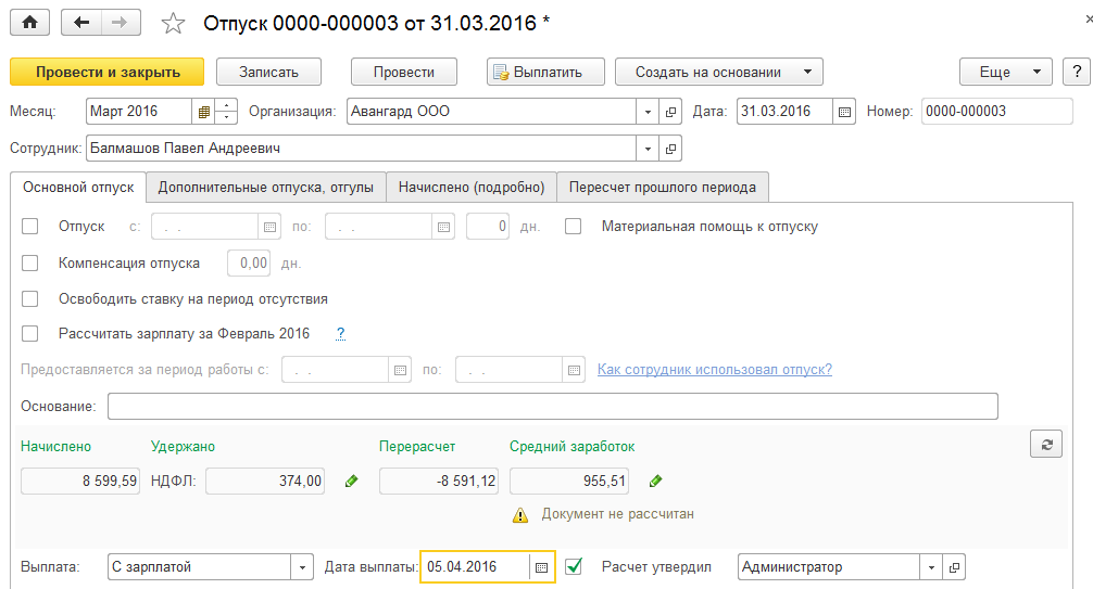 При этом будет создан новый документ-исправление с месяцем начисления Март. Новые сроки отпуска по 07.03.16 - укажем во вновь созданном документе, перерасчет будет произведен автоматически.