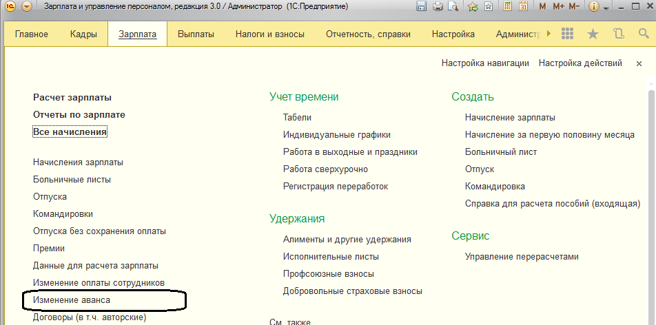 Доступ к документу осуществляется в разделе "Зарплата / Изменение аванса".