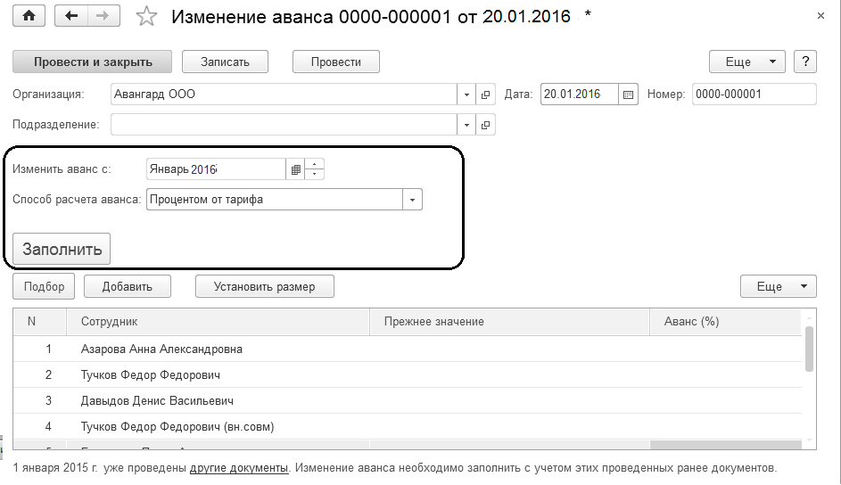 В ООО "Авангард" принято решение с 20.01.2016 выплачивать аванс в размере 40% от тарифа. Поскольку всем сотрудникам в кадровых документах был назначен способ авансовой выплаты по расчету, необходимо изменить способ получения аванса.
