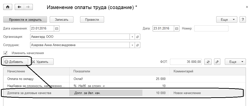 1. С 23.01.16 сотруднице ООО "Авангард" Азаровой А.А. назначена доплата за деловые качества – 10 000 руб. Откроем раздел "Зарплата / Изменения оплаты труда" и добавим документ "Изменение оплаты труда" на 23.01.2016. Добавим новое начисление.
