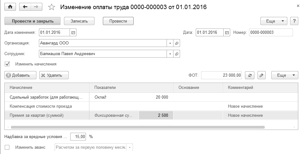 3. С 01.01.16 сотрудник ООО "Авангард" Балмашов П.А. получает компенсацию стоимости проезда (размер компенсации задается отдельно для всей организации), а также ему будет начисляться квартальная премия в сумме 2 500 руб. (в рамках курса мы берем эту премию суммой, т.к. расчет зарплаты у нас получится за небольшой период; обычно же это процентные премии от фактического заработка прошлого квартала; задача обучения – показать, каким способом можно задавать начисление и где и как мы получим результат). Воспользуемся документом "Изменение оплаты труда", чтобы ввести указанные сведения.