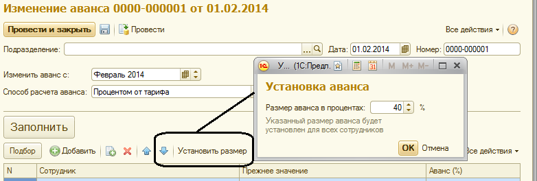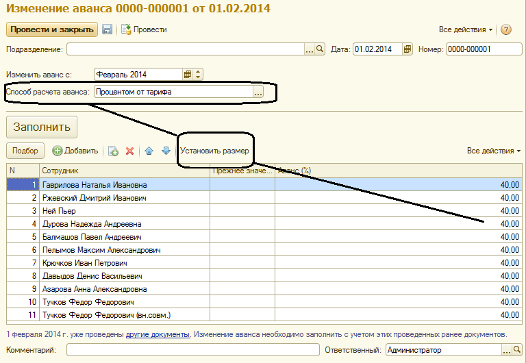 В рамках учебной базы нам необходимо рассмотреть различные способы выплаты аванса. Поэтому используя документ "Изменение аванса", изменим способ получения авансовой суммы – 40% от тарифа сотрудника с февраля 2014.