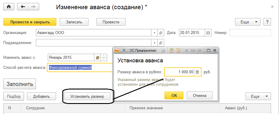 Обратите внимание, что поле «Прежний размер»- пустое, т.к. ранее способ получения аванса предполагал расчет.