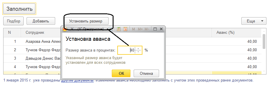 В ООО «Авангард» принято решение с 20.01.2015 выплачивать аванс в размере 40% от тарифа. Поскольку всем сотрудникам в кадровых документах был назначен способ авансовой выплаты по расчету, необходимо изменить способ получения аванса.