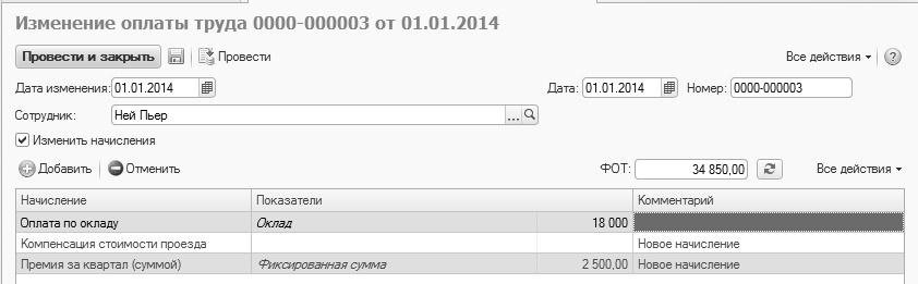 Зарегистрируем документ "Изменение оплаты труда"