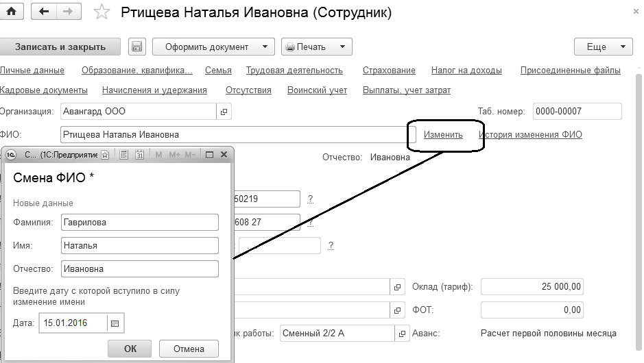 Сотрудница Ртищева Н.И. вышла замуж в январе 2016 года. Ею был получен новый паспорт с новой фамилией. Необходимо внести изменения в программу. Для этого откроем карточку физического лица Ртищева Н.И., нажмем ссылку "Изменить ФИО". Новая фамилия – Гаврилова, с 15.01.2016