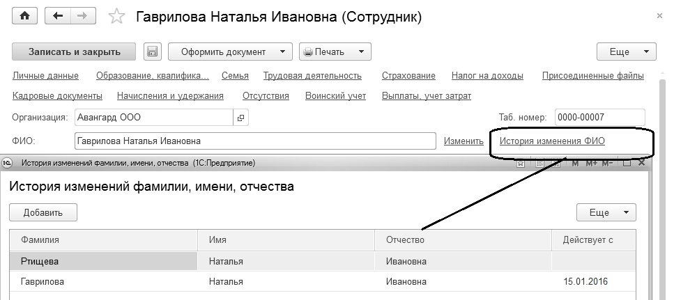 История изменения ФИО сотрудника можно просмотреть по ссылке "История ФИО".