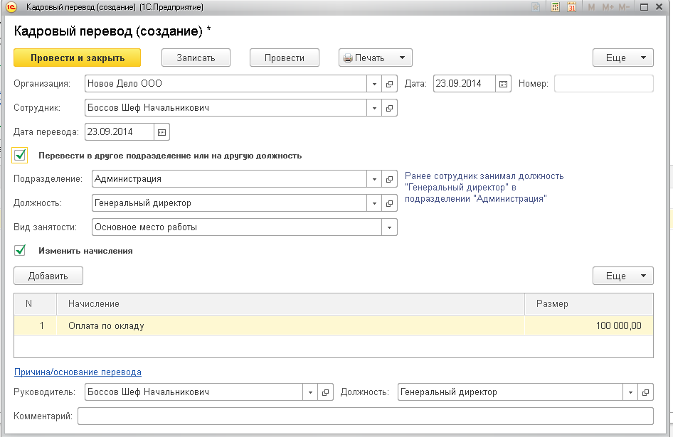 С помощью документа Кадровое перемещение можно перевести сотрудника в другое подразделение, на другую должность, а также изменить текщие начисления или добавить новые.