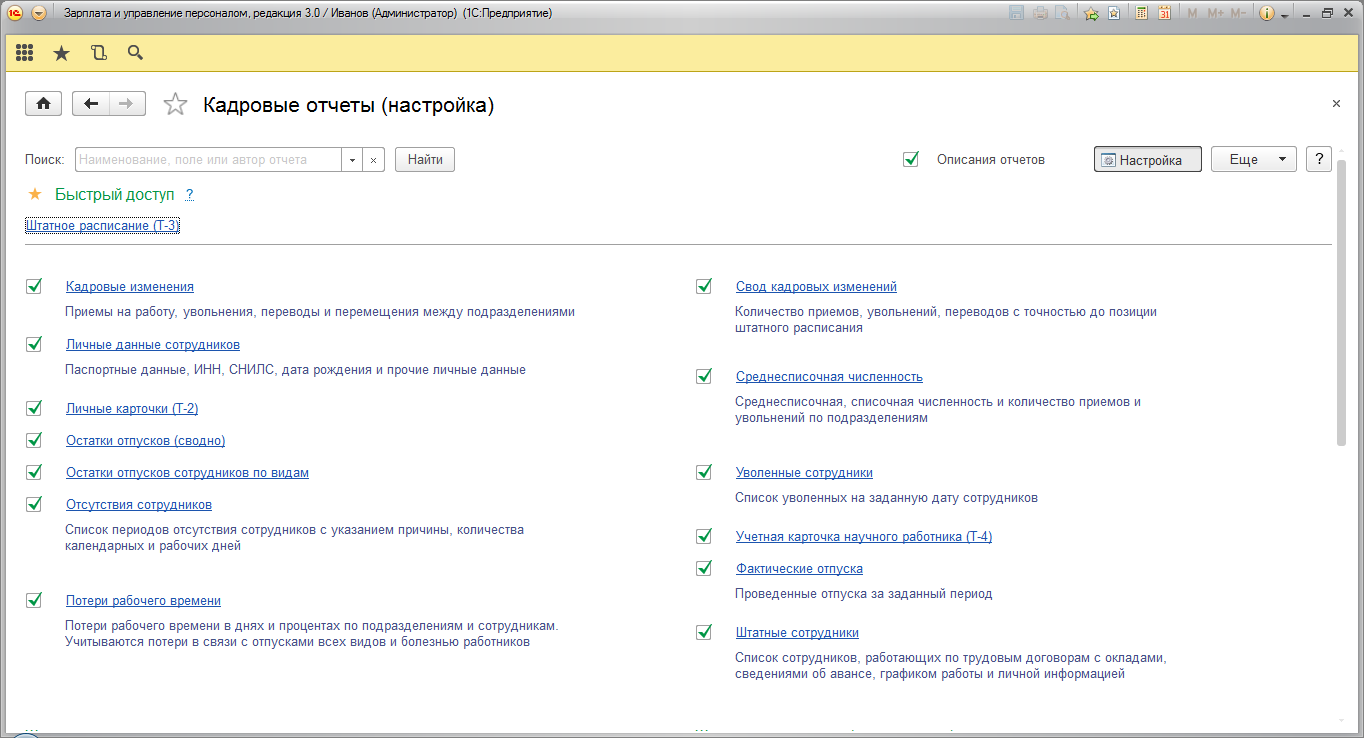 Сформируем отчеты по кадровому учету. Настроим Быстрый доступ к часто используемым отчетам