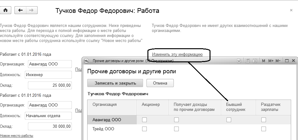 Здесь же можно изменить роль физического лица – если человек не является сотрудником, либо является, но также получает какие-либо доходы как стороннее физическое лицо. Обычно данные роли присваиваются автоматически при создании соответствующего документа для сотрудника (например, если сотрудник будет задействован в документе "Дивиденды", то он "получит" роль "Акционер").