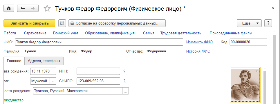 Рассмотрим карточку физического лица Тучков Федор Федорович. Для этого откроем справочник "Физические лица" и откроем сведения о выбранном физическом лице.