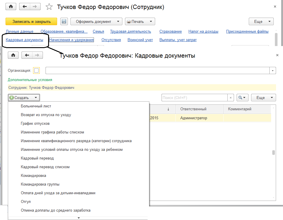 Кроме того, здесь доступна возможность создания кадровых документов, расчетных документов, просмотра уже созданных документов по сотруднику по уже имеющимся ссылкам.