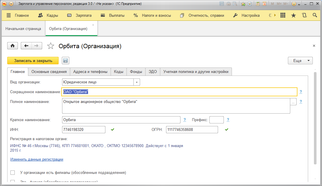 Сведения об организациях, необходимые для автоматического заполнения форм отчетности, а также для расчета и учета зарплаты, НДФЛ и страховых взносов, вводятся и редактируются в карточке организации.