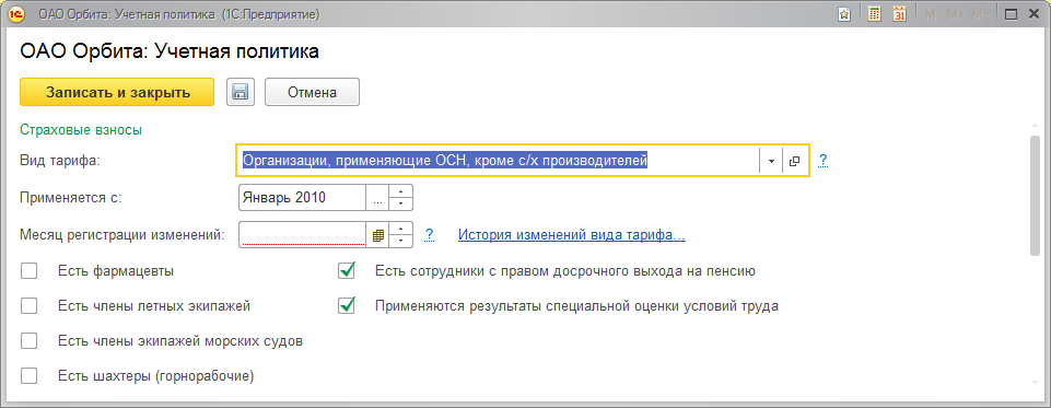 В разделе Страховые взносы указывается вид тарифа страховых взносов на обязательное пенсионное, медицинское и социальное страхование. По умолчанию в поле Вид тарифа указывается основной тариф (Организации, применяющие ОСН, кроме с/х производителей), установленный для плательщиков с соответствующей системой налогообложения. Если организация относится к другой категории плательщиков, то в поле Вид тарифа необходимо выбрать соответствующий тариф. В случае изменения категории плательщика необходимо указать, с какого месяца (поле Применяется с) применяется новый тариф. Форму со сведениями об истории изменения применяемого тарифа можно открыть по ссылке История изменений вида тарифа.