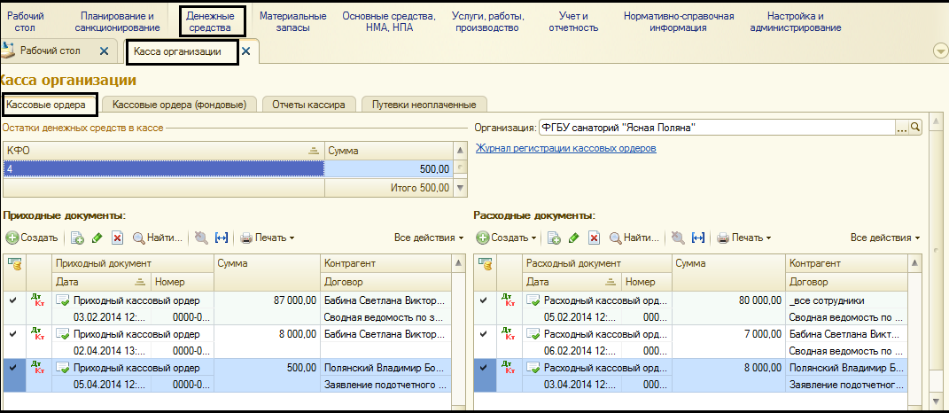 Закладка Кассовые ордера содержит списки приходных и расходных документов, а также таблицу, в которой отражаются остатки наличных денежных средств в кассе в разрезе КФО на текущую дату.