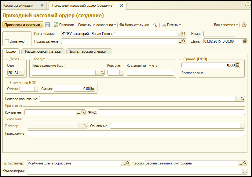 Документ предназначен для оформления поступления наличных денежных средств в рублях и в другой валюте в кассу учреждения приходным кассовым ордером по форме № КО-1 (код по ОКУД 0310001) и формирования соответствующих проводок.