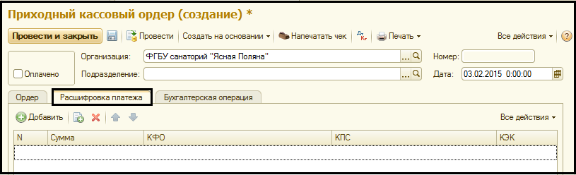В строках табличной части указываются суммы по приходному кассовому ордеру в разрезе КФО, КПС и КЭК.