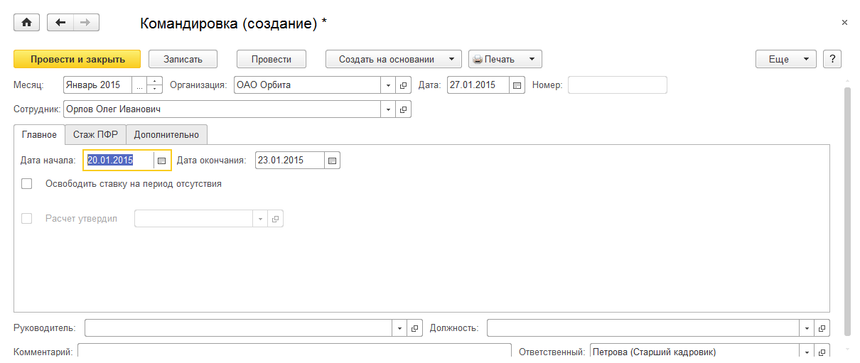 Основным условием командировки является ее период. Для расчета достаточно указать дату начала и окончания. Период указывается полностью, включая дни нахождения сотрудника в пути.
