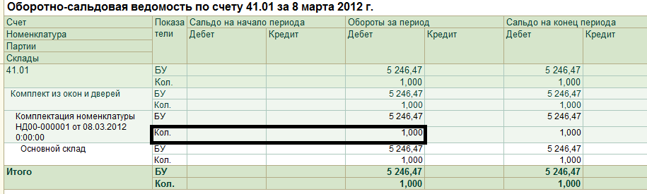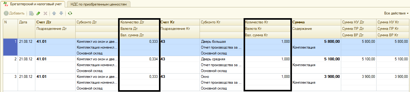 На выходе хотим получить 1 комплект, состоящий из трех видов товаров. Следовательно, данный документ формирует три бухгалтерские записи, но по Дт счета в реквизите количество отражается не целое число. В виду того, что и счет по Дт и счет по Кт имеет количественный учет и из нескольких частей необходимо собрать одно целое, в каждой проводке по Дт счета количество дробное, но на выходе в отчетности будет отражено целое количество комплектов, без дробей.