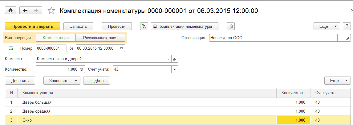 Следует обратить внимание на то, что под операцией комплектация (разукомплектация) подразумевается изменение количественно-номенклатурного состава ТМЦ при условии сохранения суммовой оценки, т.е. стоимость комплекта равна стоимости его составляющих. Учет дополнительных расходов, услуг по сборке комплекта не предусмотрен.