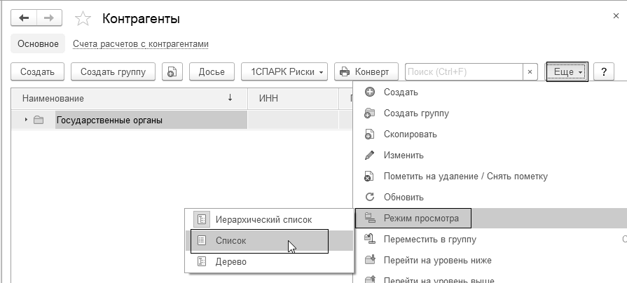 Для любой формы списка справочников для удобства введены функции печати списков. Например, в справочнике "Контрагенты/Еще/Вывести список".
