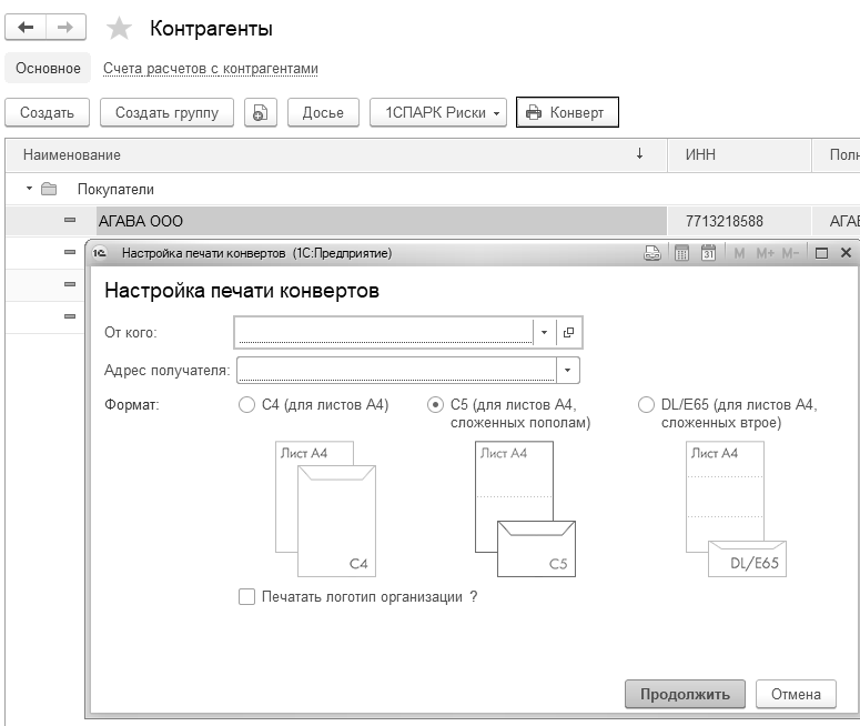 В программе для отправки письма контрагенту можно подготовить конверт с заполненными реквизитами отправителя и получателя. При желании на конверте можно напечатать логотип организации – для этого нужно установить соответствующий флаг. Загрузить логотип можно в карточке организации в сворачиваемой группе "Логотип и печать". Распечатать конверт можно в форматах С4, С5 и DL/E65 ("европейский" формат). Сделать это можно из справочника "Контрагенты", применив кнопку "Конверт" (рис. 1.11.10).