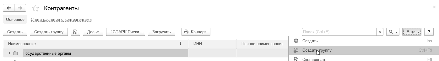 Если бухгалтеру требуется переместить контрагента из одной группы в другую (ошибочно занес не в ту папку), то такая операция возможна. Встаньте на тот элемент, который следует переместить, нажмите правую клавишу мыши/Переместить в группу. После чего, указываете новую группу. Это один из способов перемещения. Второй способ – открыть карточку контрагента и в форме указать новую группу (см. реквизит "Группа"). Такую реструктуризацию можно делать во всех справочниках, которые имеют многоуровневую структуру.
