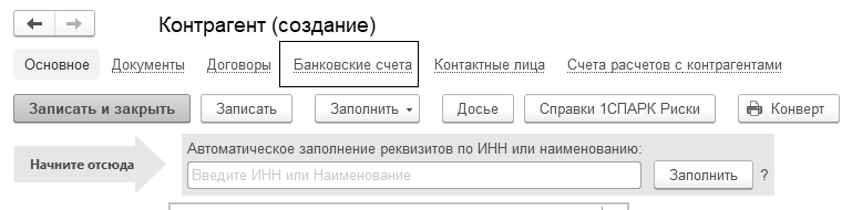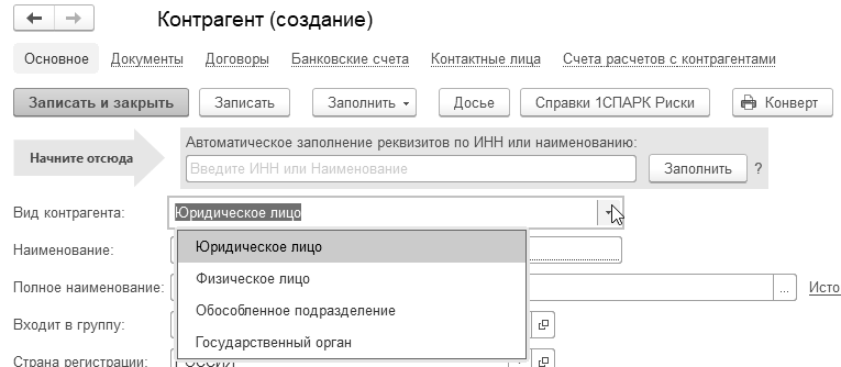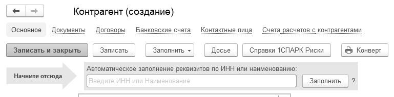 Создать нового контрагента с помощью функции автозаполнения можно из любого документа вводом ИНН в реквизит "