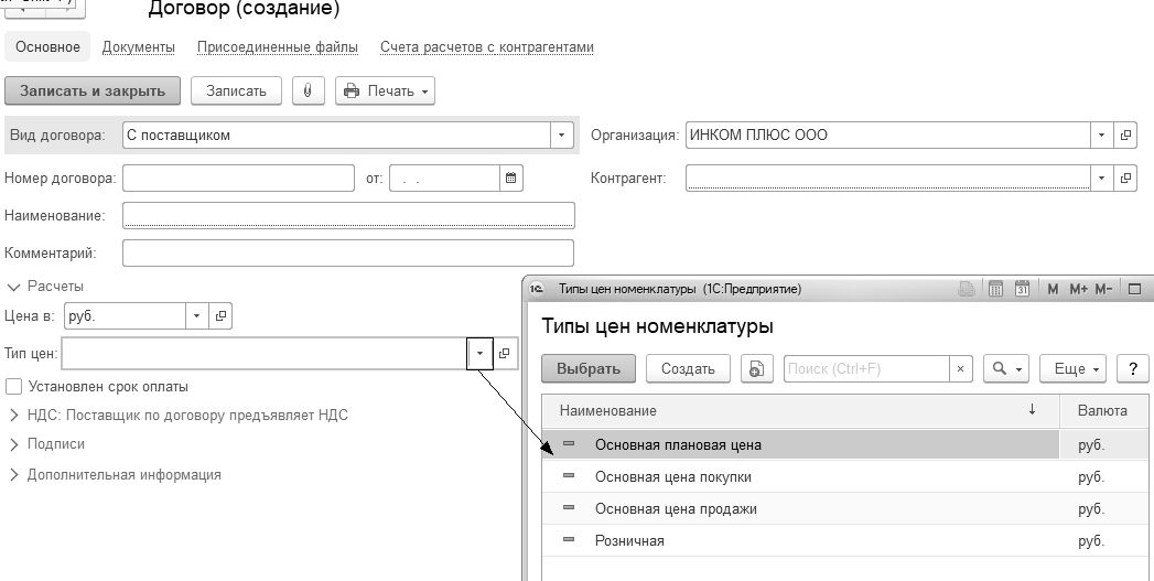 Каждому договору может соответствовать свой тип цен. Лучше вообще ничего не выбирать, если нет уверенности в необходимости такого выбора (рис 1.11.8).