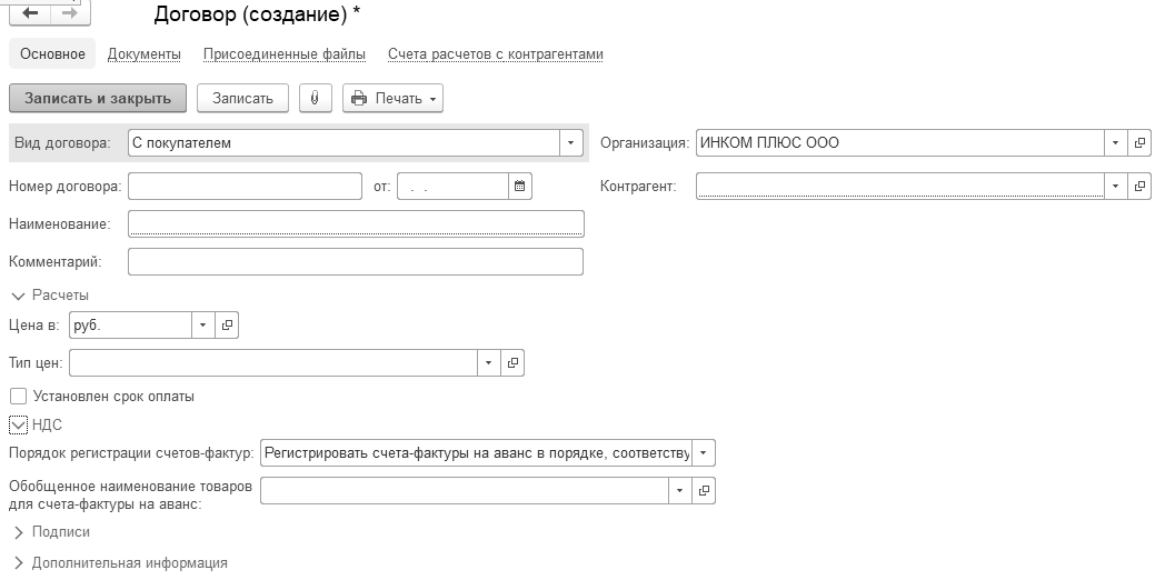Создать" можно заполнить данные нового договора. Для каждого договора задается реквизит "Вид договора":