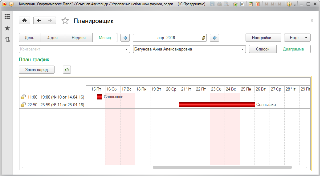 Помимо Календаря сотрудника, сведения о загрузке персонала может дать и форма "Планировщик" (Рис. 242). В ней представлены Заказ-наряды и Заказы на производство, с детализацией по ответственным.