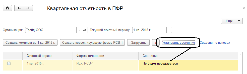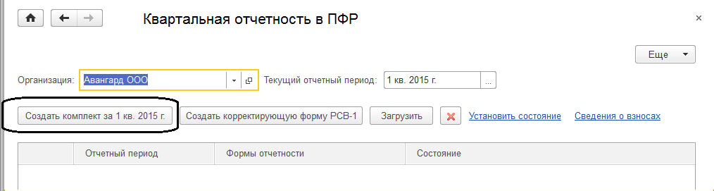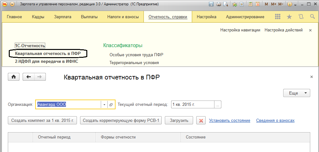Сформируем квартальный отчет по персонифицированному учету с использованием обработки "Квартальная отчетность в ПФР" за 1 кв.2015г. для ООО «Авангард» и для ООО «Трейд».